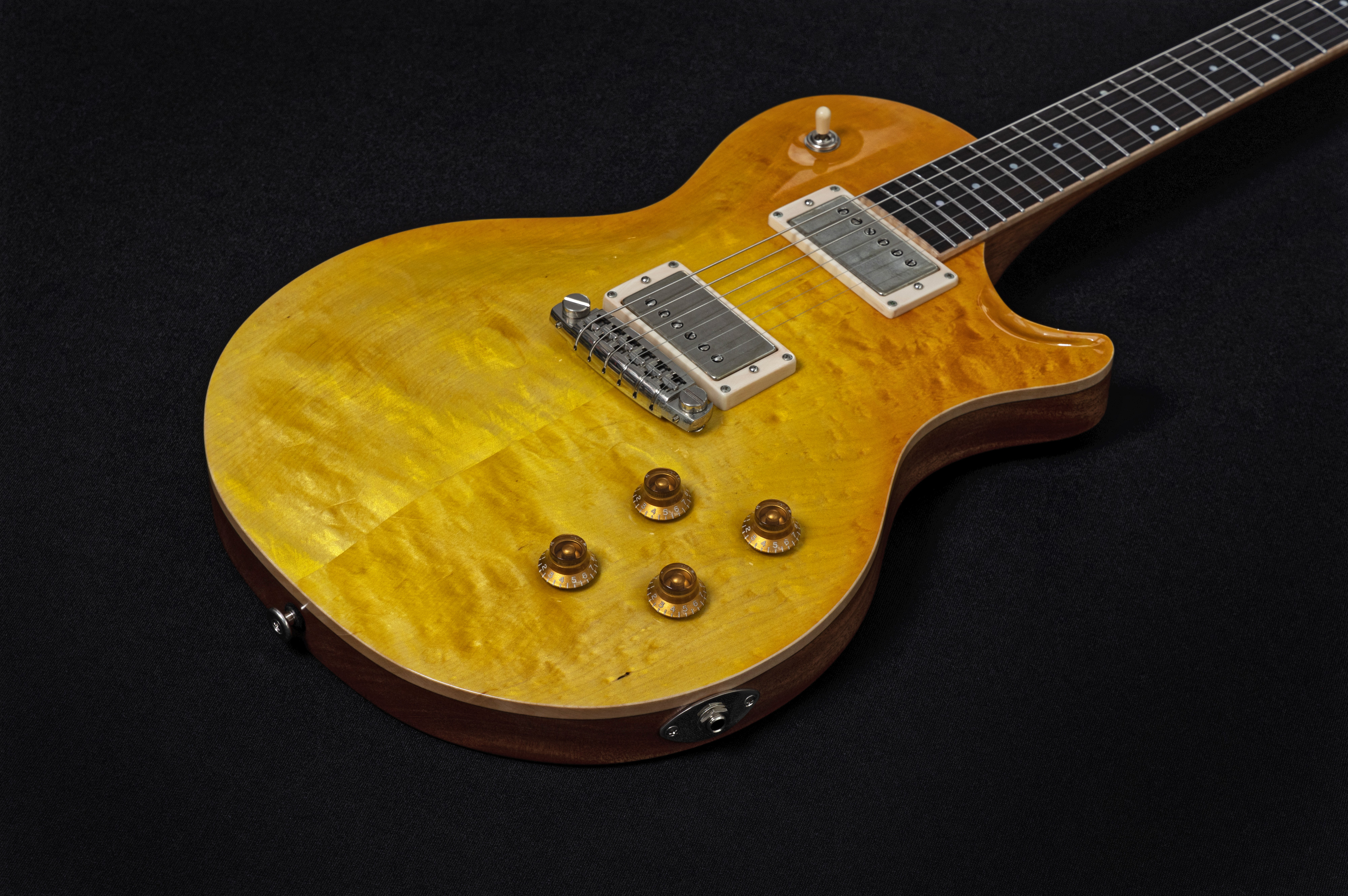 The 625 is my take on the classic singlecut design with some modern appointments. It features a premium-grade curly maple carved top, 625mm scale, stainless steel frets and an all access neck joint and cutaway. It comes with a custom wound set of OX4 Pickups, an adjustable wraparound tailpiece or traditional tunomatic bridge and staggered 3x3 locking or traditional tuners.